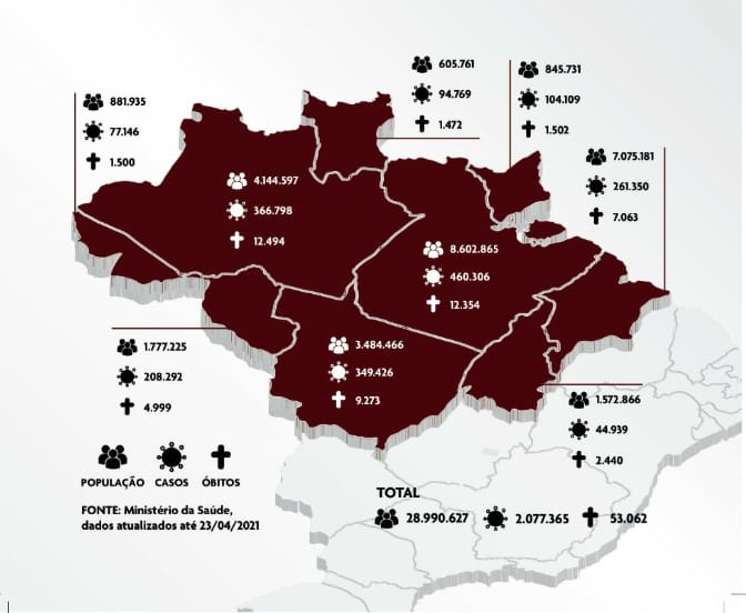 Segundo dados do Ministério da Saúde, em 23 de abril de 2021, o Brasil registrou 69.105 novos casos de Covid-19. Até essa data, em uma população de 210.147.125 habitantes, 14.237.078 tinham sido contaminados com o vírus. Dentre essas pessoas, 386.416 perderam a vida para a doença, 12.711.103 estão recuperadas e 1.139.559 estão em acompanhamento.