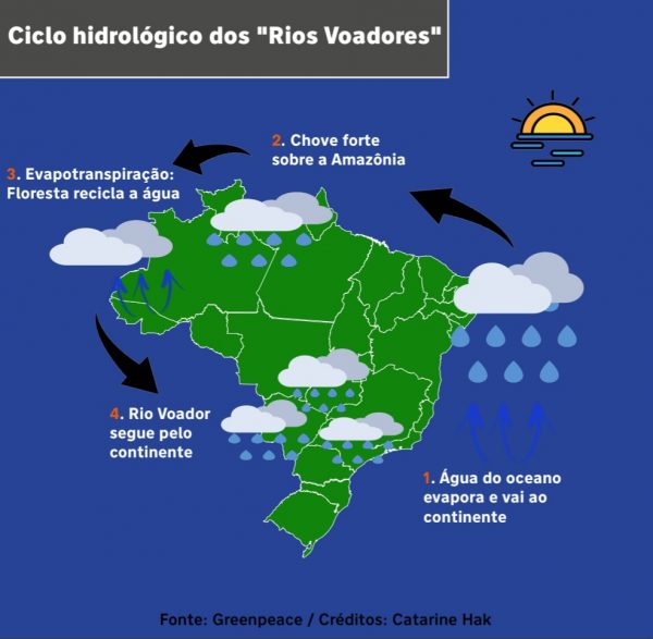 É nesse ponto que o desmatamento da Floresta afeta a previsibilidade do ciclo hidrológico. “Com o desmatamento, esses ‘rios voadores’ estão perdendo sua periodicidade e diminuindo a quantidade de água”, explica o biólogo e líder do projeto de queimadas e desmatamento do Greenpeace Brasil na campanha de Amazônia, Rômulo Batista.