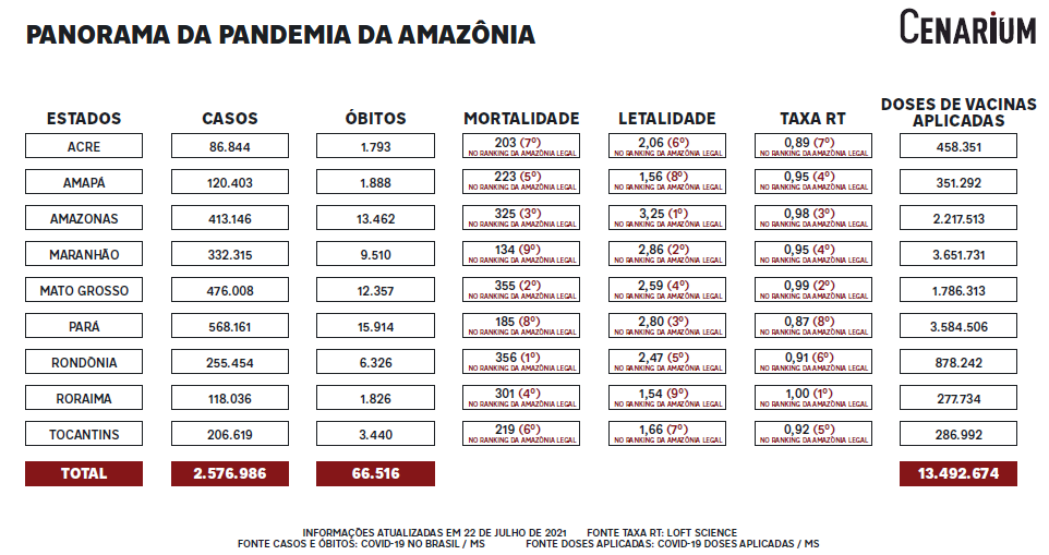 Com Estados que se dividem em três regiões brasileiras, a Amazônia Legal já acumula 2,57 milhões de casos positivos de Covid-19, desde que a pandemia do novo coronavírus chegou ao Brasil, em março de 2020, o equivalente a 13,19% dos 19,52 milhões de casos confirmados no País. O número de óbitos também é expressivo, totalizando 66.516, ou, 12,15% dos 547.016 contabilizados até o dia 22 de julho em todo o território brasileiro.