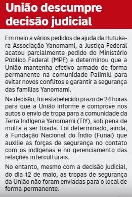 A Hutukara chegou a enviar um primeiro ofício, antes do ataque no dia 10 de maio, à Frente de Proteção Etnoambiental Yanomami da Fundação Nacional do Índio (Funai), à superintendência da Polícia Federal em Roraima (PF/RR) e ao Ministério Público Federal em Roraima (MPF/RR). O documento, do dia 30 de abril, já relatava um conflito ocorrido no dia 27 de abril.