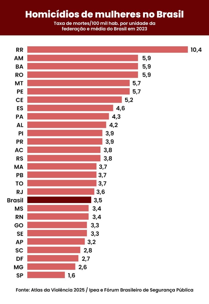 Em contraste, Estados do Sudeste e Sul apresentaram os menores índices de homicídios de mulheres. São Paulo registrou a menor taxa do País, com 1,6 mortes por 100 mil habitantes, seguido por Minas Gerais (2,6) e o Distrito Federal (2,7).