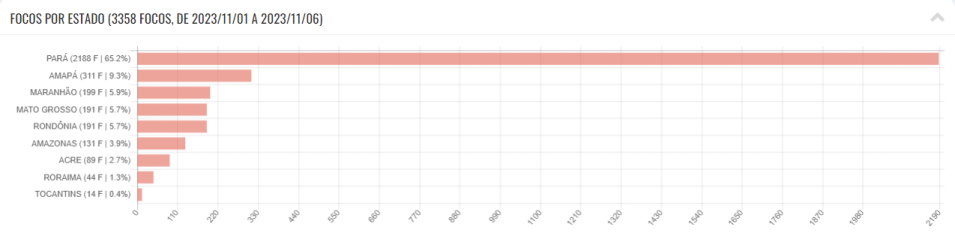No topo da lista está o Pará, com 2.188 focos, o que corresponde a 65,2% do total geral, que é de 3.360. O Estado vive um dos piores momentos do período de incêndios florestais e, segundo o Governo do Amazonas, imagens de satélite mostram o impacto dessas queimadas na qualidade do ar próximo à região do Baixo Amazonas e na intensificação da fumaça sobre a capital Manaus.