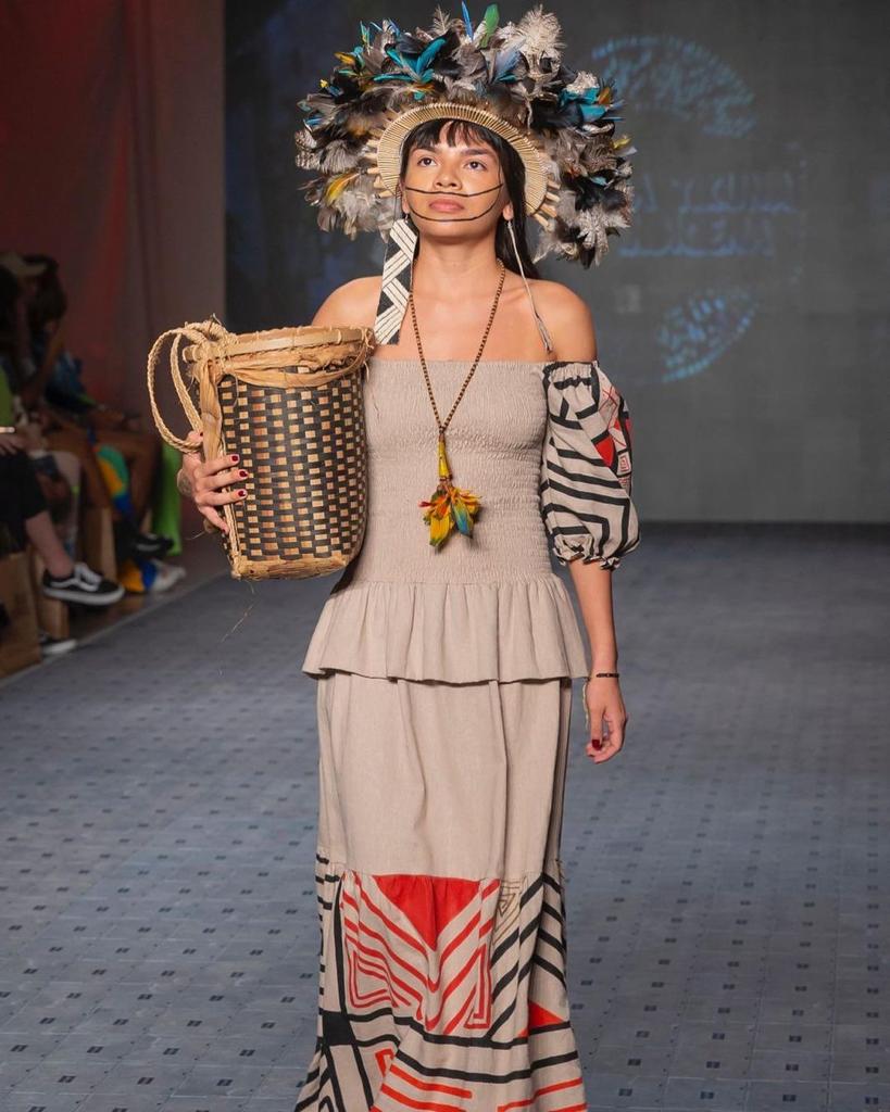 Estilista Tikuna transforma passarela em aldeia durante desfile na Brasil Eco Fashion Week em SP