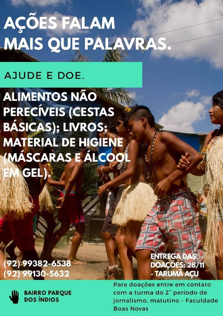 MANAUS – “Ações que falam mais que palavras” é o tema da campanha solidária, mobilizada por estudantes do curso de jornalismo da Faculdade Boas Novas, de Manaus, que promove a arrecadação de alimentos não perecíveis para destinar aos indígenas da comunidade do Parque das Tribos, no bairro Tarumã Açu, Zona Oeste da capital amazonense.
