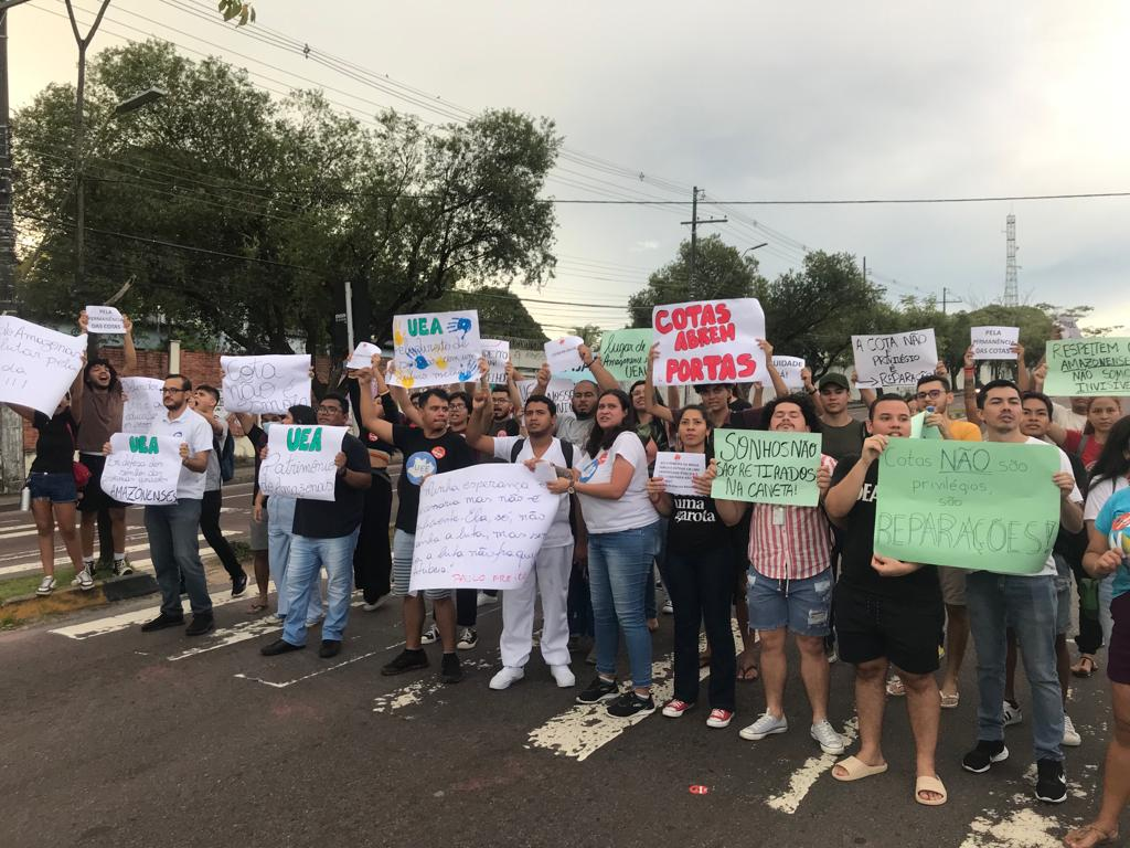 MANAUS – Na tarde desta sexta-feira, 28, um grupo de estudantes da Universidade do Estado do Amazonas (UEA) realizou um protesto em frente ao prédio da reitoria da instituição. Na pauta dos estudantes está a polêmica decisão do Supremo Tribunal Federal (STF) que derrubou a política de cotas que reserva 80% das vagas oferecidas pela UEA a estudantes da região. A medida, segundo os acadêmicos, atinge, diretamente, os jovens do Amazonas que postulam uma vaga na instituição.