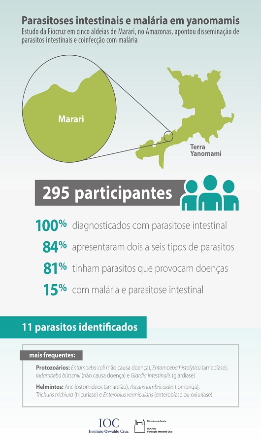 De acordo com o estudo, todos os participantes apresentavam parasitas intestinais, sendo 81% deles portadores de micro-organismos causadores de doenças como amebíase e verminoses. Além disso, cerca de 15% dos indígenas apresentaram, simultaneamente, parasitose intestinal e malária. Alguns casos analisados tinham duas ou mais espécies de parasitas intestinais.