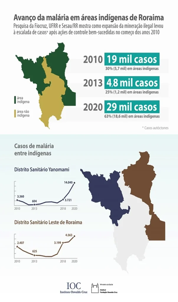 As associações alertam que o problema se agravou durante o primeiro ano da pandemia, quando Roraima registrou 29 mil casos de malária, sendo que mais de 18 mil notificações ocorreram em áreas indígenas, representando 62% do total de casos.