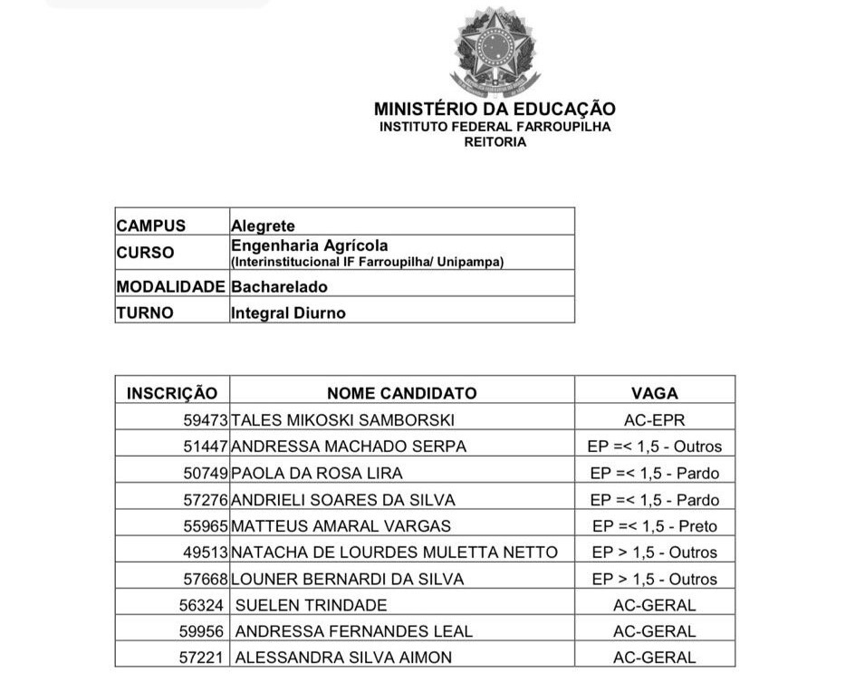 “Em 2014 o estudante Matteus Amaral Vargas ingressou no curso de bacharelado em Engenharia Agrícola oferecido em conjunto com a Unipampa. A inscrição dele foi feita nas vagas destinadas a candidatos pretos/pardos. Essas informações constam no Edital no 046/2014, que é público e traz o resultado da seleção desse curso naquele ano. Esse curso, oferecido em conjunto com a Unipampa, não é mais ofertado pelo IFFar desde 2021. O Matteus Amaral Vargas também não é mais estudante do IFFar.