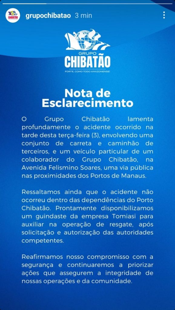 O Grupo Chibatão divulgou uma nota à imprensa lamentando profundamente o acidente. Veja a íntegra da nota: