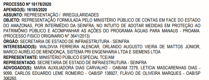 Os três ex-titulares da Seinfra chefiaram a pasta durante as gestões de Eduardo Braga (MDB) e Omar Aziz (PSD) no Governo do Amazonas, entre os anos de 2003 e 2014. A publicação aponta que os conselheiros Amazônia Lins Rodrigues, Érico Xavier Desterro e Silva, Ari Jorge Moutinho da Costa Júnior, Mario Coelho de Mello e Luis Fabian Pereira Barbosa seguiram o relator do caso. O conselheiro Júlio Assis Corrêa Pinheiro se declarou impedido.