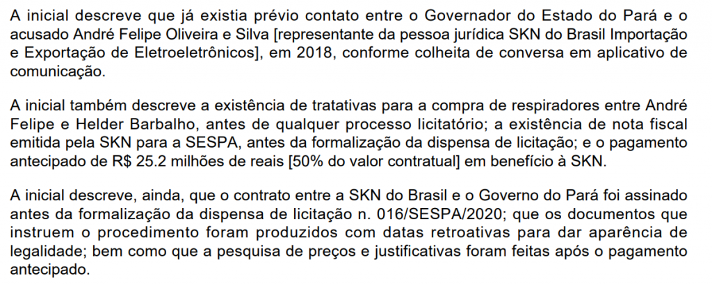 A denúncia descreve que havia tratativas entre Helder Barbalho e o empresário André Felipe de Oliveira da Silva, representante da SKN, desde 2018, por meio de conversas em um aplicativo de mensagens. O texto também aponta que houve negociações para a compra de respiradores entre os dois antes de qualquer processo licitatório, além da emissão de nota fiscal da SKN para a Secretaria de Estado de Saúde do Pará (Sespa) antes da formalização da dispensa de licitação.