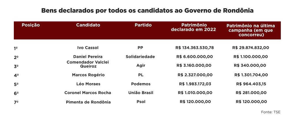 O candidato do PL, Marcos Rogério, declarou à Justiça ter um terreno avaliado em R$ 1,4 milhão, além de um apartamento de mais de R$ 500 mil, entre outros bens, acumulando R$ 2,3 milhões. Em 2018, quando se elegeu senador por Rondônia, ele tinha pouco mais de R$ 1 milhão.