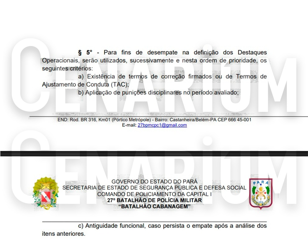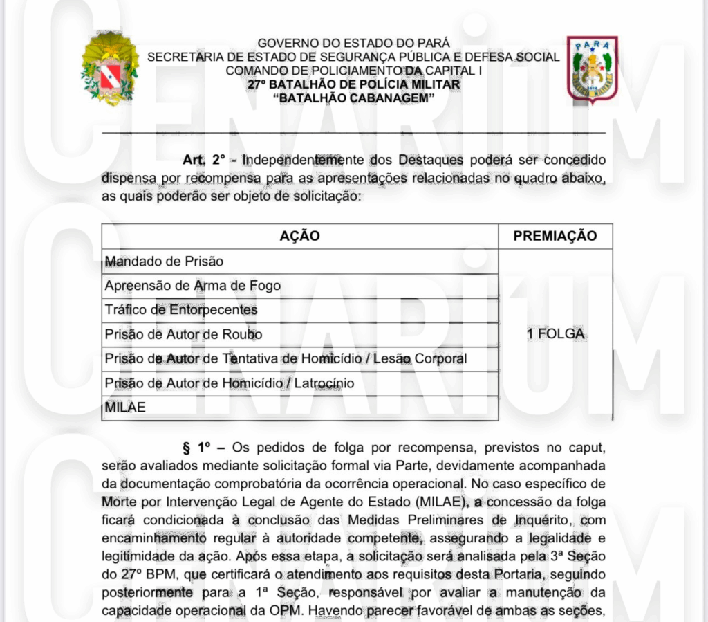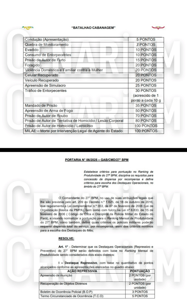 BELÉM (PA) – Uma minuta de portaria em nome do comandante do 27º Batalhão da Polícia Militar do Pará (PM-PA), major Bruno Gama Pereira, estabelece um ranking de produtividade, de 2 a 100 pontos, que recompensa com folgas os militares por diferentes tipos de ocorrências, entre elas, mortes por intervenção policial durante operações. A CENARIUM teve acesso, com exclusividade, ao documento datado de 16 de julho de 2025. A medida, que ainda não entrou em vigor, fez a Comissão de Direitos Humanos da Ordem dos Advogados do Brasil – Seção Pará (OAB-PA) classificar a iniciativa como preocupante por abrir espaço para práticas violentas e discriminatórias.