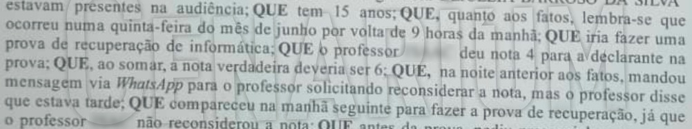 No dia da prova de recuperação, dentro da sala de aula, a aluna afirmou que, após questionar o docente se ele lhe entregaria a avaliação para alcançar a nova mínima, Isac riu, passou a mão no pescoço dela “e desceu até os ombros”. A estudante de 15 anos disse às autoridades que foi liberada da prova antes de realizá-la, e que o docente mandou que ela fosse à sala de informática da instituição. A vítima relatou, ainda, que o professor já havia lhe tocado outras vezes, “mas, dessa vez, ficou mais abalada”. Veja trecho do depoimento à PF: