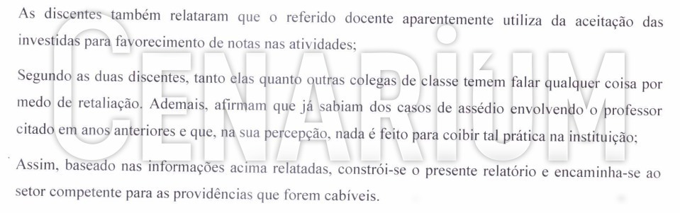“As discentes também relataram que o referido docente aparentemente utiliza da aceitação das investidas para favorecimento de notas nas atividades. Segundo as discentes, tanto elas quanto outras colegas de classe temem falar qualquer coisa por medo de retaliação. Ademais, afirmam que já sabiam dos casos de assédio envolvendo o professor citado em anos anteriores e que, na sua percepção, nada é feito para coibir tal prática na instituição”, diz outro trecho. Veja:
