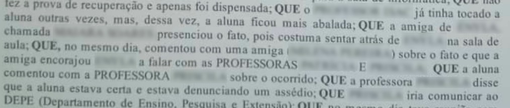 A colega de classe da vítima disse à equipe de apoio técnico pedagógica que presenciou a situação envolvendo a estudante e pontuou que o professor “sempre faz suas colegas ficarem constrangidas na sala de informática”. De acordo com os relatos, o servidor, “quando vai explicar algo no computador, fica muito perto do rosto (quase beijando)” e tem costume de “acariciar as alunas nos braços e ombros”. Outras situações foram relatadas, mas o relatório não especifica quais são.
