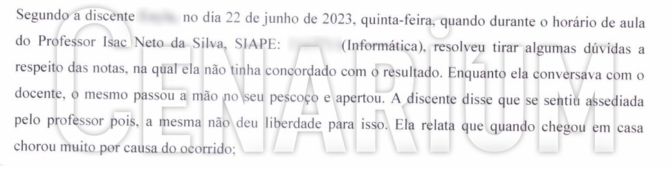“Segundo a discente, no dia 22 de junho de 2023, quinta-feira, quando durante o horário de aula do professor Isac Neto da Silva resolveu tirar algumas dúvidas a respeito das notas, na qual ela não tinha concordado com o resultado. Enquanto ela conversava com o docente, o mesmo passou a mão no seu pescoço e apertou. A discente disse que se sentiu assediada pelo professor, pois a mesma não deu liberdade para isso. Ela relata que quando chegou em casa chorou muito por causa do ocorrido”, diz trecho do documento. Veja: