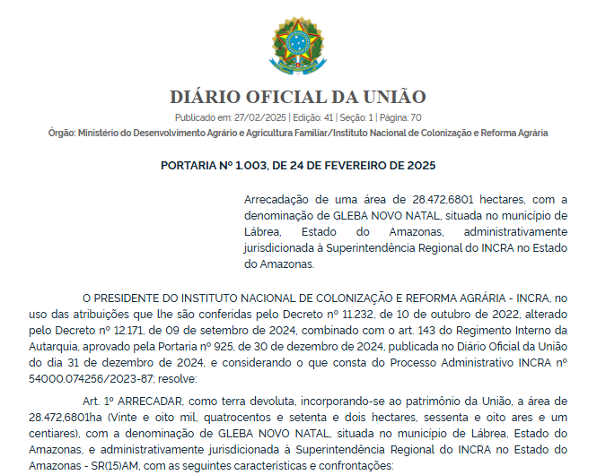 Em 2024, o Instituto Nacional da Colonização e Reforma Agrária no Amazonas arrecadou uma área de 28,4 mil hectares da Gleba Novo Natal para transformar a Comunidade Marielle Franco em um assentamento. A portaria foi publicada no Diário Oficial da União no dia 27 de fevereiro.