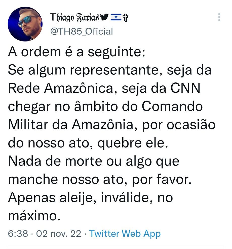 Na semana passada, um apoiador da extrema-direita fez uma postagem no Twitter onde fez ameaça a profissionais da Rede Amazônica e CNN Brasil. Na postagem, o homem identificado como Thiago Farias dizia: “A ordem é a seguinte: Se algum representante, seja da Rede Amazônica, seja da CNN chegar ao âmbito do Comando Militar da Amazônia, por ocasião do nosso ato, quebre ele. Nada de morte ou algo que manche o nosso ato, por favor. Apenas aleije, invalide, no máximo”, dizia na postagem, que foi removida pela plataforma em seguida.