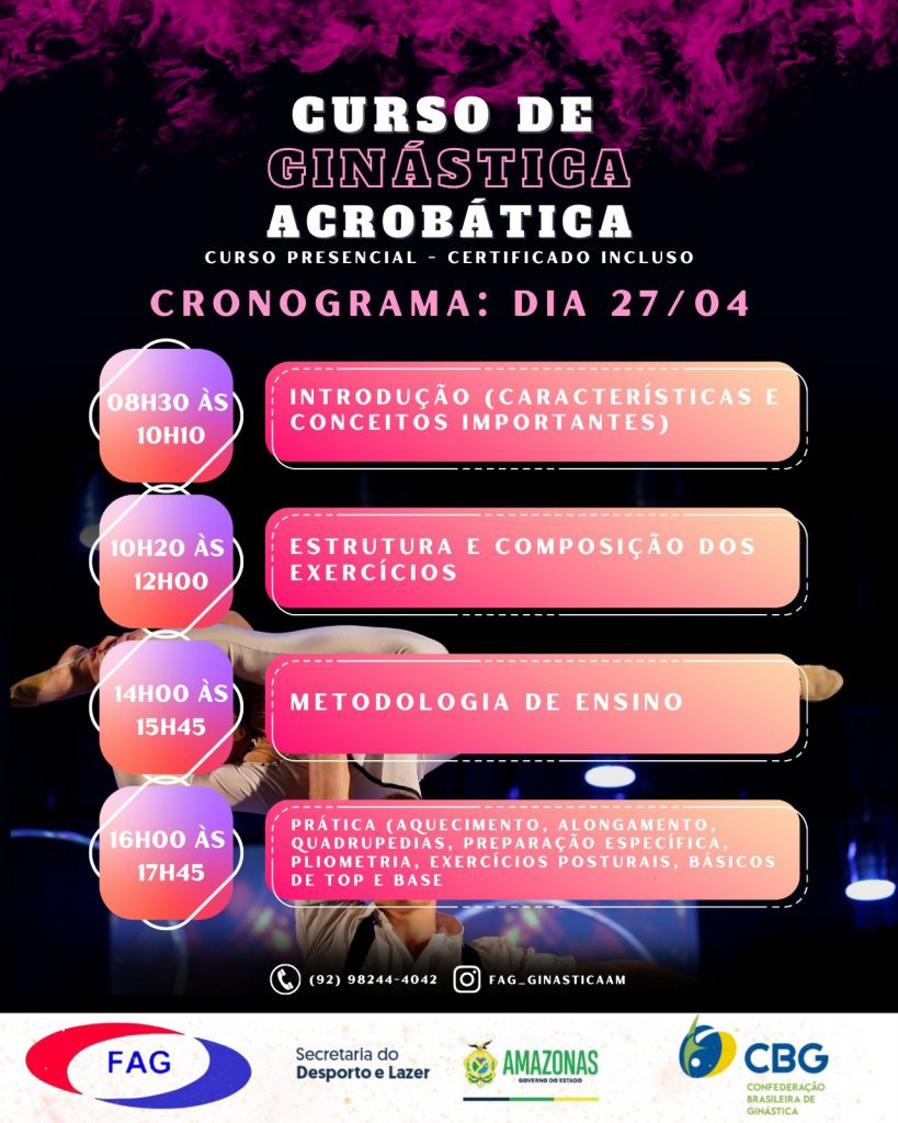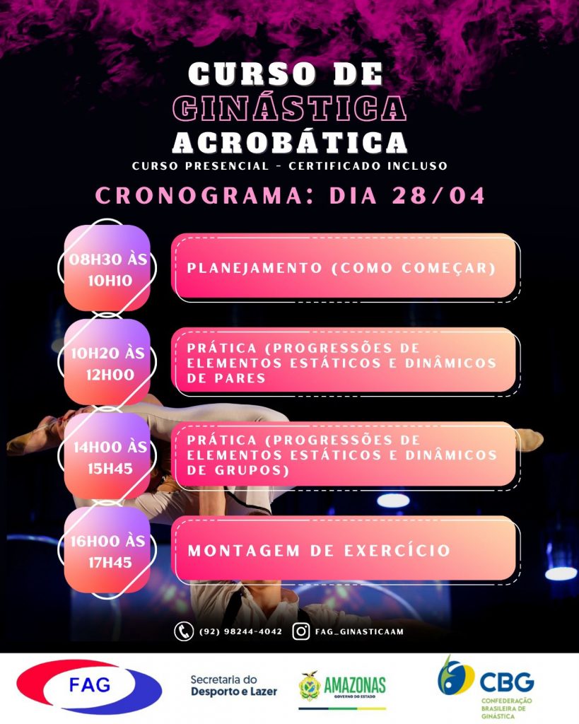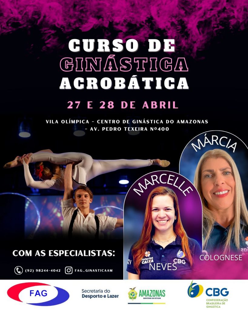 MANAUS – A Federação Amazonense de Ginástica (FAG) está com inscrições abertas para o curso de ginástica acrobática em Manaus, que acontecerá nos dias 27 e 28 de abril, no Centro de Ginástica do Amazonas, localizado nas dependências da Vila Olímpica, na Avenida Pedro Teixeira, bairro Dom Pedro I, Zona Centro-Oeste da cidade. O curso conta com o apoio do Governo do Amazonas, da Secretaria do Desporto e Lazer (Sedel) e da Confederação Brasileira de Ginástica (CBG).