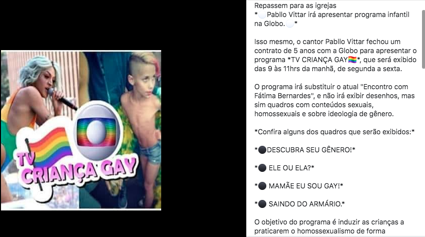 “Isso mesmo, o cantor Pabllo Vittar fechou um contrato de 5 anos com a Globo para apresentar o programa TV Criança Gay”. A Publicação que, até as 18h do dia 29 de março de 2019, tinha sido compartilhada ao menos uma centena de vezes no Facebook.