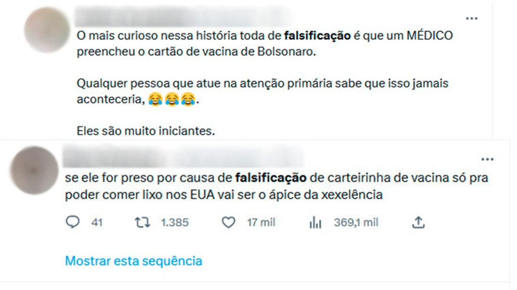 Já outro internauta tocou no uso da estrutura pública de saúde do Estado e a possível participação de um profissional médico para emitir a tal falsificação do cartão de vacinação do ex-presidente da República. “O mais curioso nessa história de falsificação é um médico preencher o cartão de vacina de Bolsonaro. Qualquer pessoa que atue na atenção primária sabe que isso jamais aconteceria. Eles são muito iniciantes”, debochou.