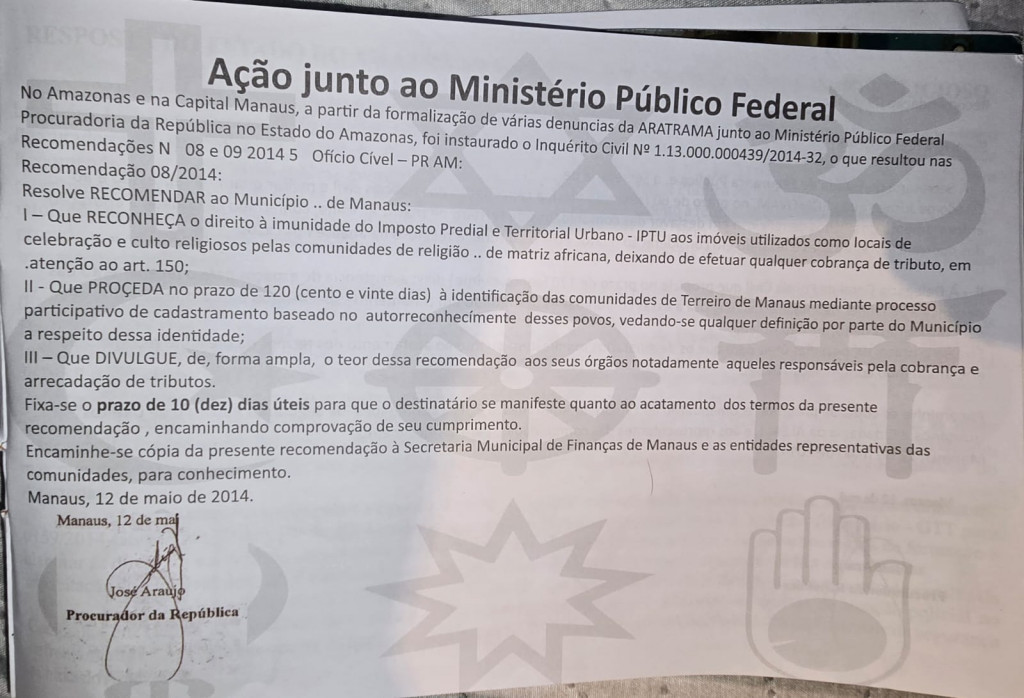 Naquele ano, o Ministério Público Federal (MPF) já havia recomendado à Prefeitura de Manaus a catalogação de espaços de matriz africana no município com o intuito de isentar do IPTU essas entidades. O inquérito civil foi instaurado por meio do procurador da República José Araújo.