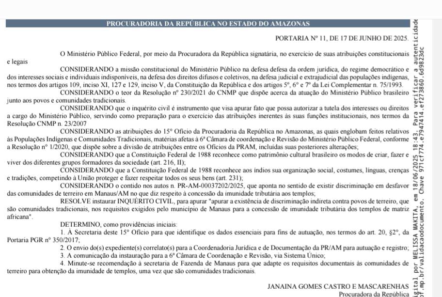 “[O MPF] resolve instaurar inquérito civil para apurar a existência de discriminação indireta contra povos de terreiro, que são comunidades tradicionais, nos requisitos exigidos pelo município de Manaus para a concessão de imunidade tributária a templos de matriz africana”, diz um trecho da publicação.