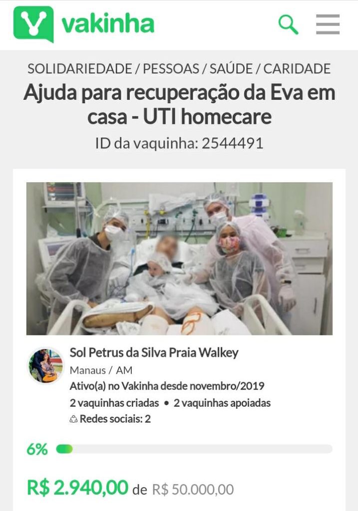 Eva foi incluída no programa “Melhor em Casa”, do Governo Federal, que vai disponibilizar insumos como a alimentação enteral, luvas, sondas de alimentação, visita médica periódica do programa com fisioterapeutas e fonoaudiólogos pelo menos uma vez por semana. O que a família precisa agora é de técnicos de enfermagem que fiquem 24h, uma condição para que o homecare seja autorizado. Para isso, Petrus continua precisando da ajuda para custear o pagamento desses cuidadores.