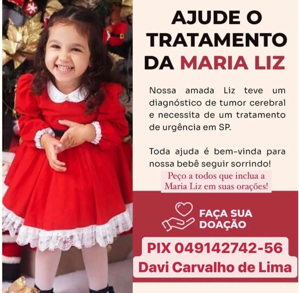 A família disponibilizou um código via Pix para quem deseja contribuir com o tratamento da pequena Maria Liz. A chave é o CPF 049.142.742-56, no nome de Davi Carvalho de Lima. Também é possível fazer transferência bancária para uma conta-corrente do banco Bradesco (237), Agência 2690, Conta-Corrente 1003018-8.