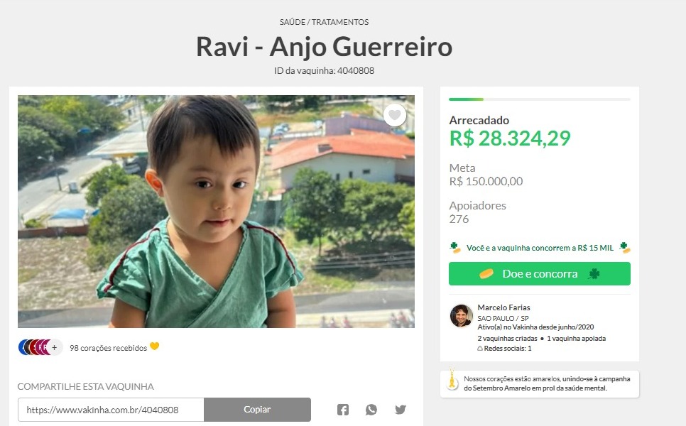 A família de Ravi precisa de R$ 150 mil para arcar com os custos de médicos especializados e o tratamento intensivo. Até o momento, cerca de 20% do total da “vakinha” foi atingido, com doações que somam R$ 28 mil.