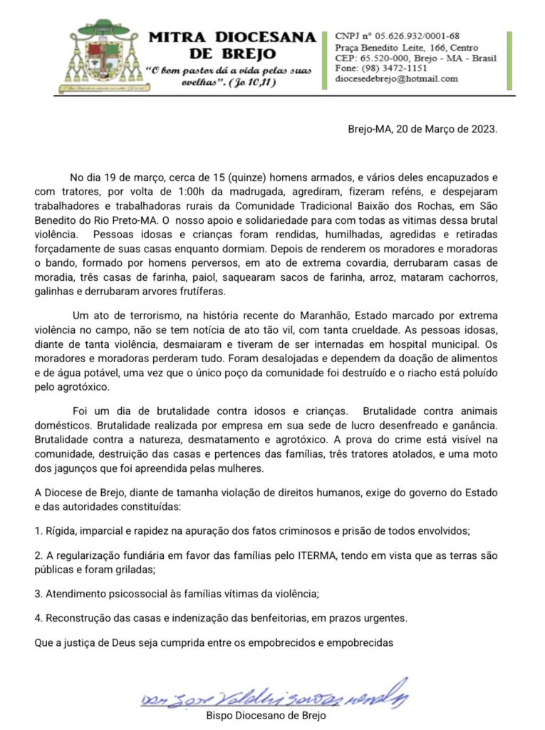 A Mitra Diocesana do Brejo prestou solidariedade e apoio as famílias, e se referiu ao ataque como “ato de terrorismo”. Além disso, exigiu que a punição dos criminosos seja apurada e que ocorra, urgentemente, a regularização fundiária em favor das famílias. A diocese pediu, ainda, atendimento psicossocial às famílias vítimas da violência e a reconstrução das casas e indenização das benfeitorias.