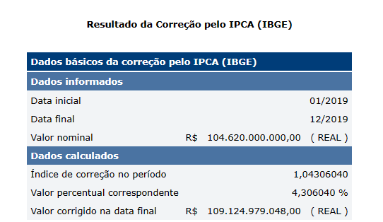 Com base no cálculo do Índice Nacional de Preços ao Consumidor Amplo (IPCA) — indicador que mede a variação dos preços de um conjunto de produtos e serviços vendidos no varejo e consumidos pelas famílias brasileiras —, o valor corrigido do faturamento de 2019 seria atualmente de R$ 109,1 bilhões, com índice de correção de 1,4.