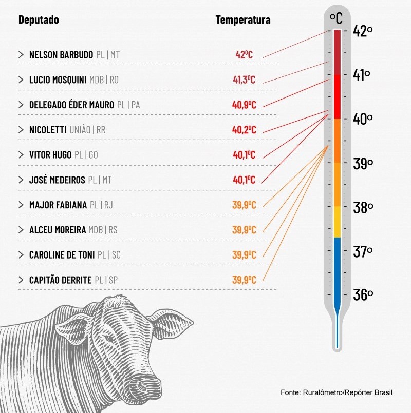 No ranking que totaliza 499 políticos, o deputado fica atrás de Nelson Barbudo (PL-MT), Lucio Mosquini (MDB-TO) e Delegado Éder Mauro (PL-PA), com 40,2°C de “febre”. Fechando o “top 5” está o deputado Vitor Hugo (PL-GO). Cada parlamentar recebeu uma pontuação entre 36°C a 42°C – equivalente à temperatura corporal. Quanto pior o desempenho, mais alta é sua temperatura. Classificações acima de 37,4°C indicam “febre ruralista”, referente à atuação desfavorável.