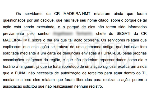 O documento aponta que a pressão representou uma intimidação direta, criando um ambiente de insegurança para os fiscais. Segundo o relatório, tais pressões também teriam sido exercidas por lideranças indígenas vinculadas ao Ministério dos Povos Indígenas (MPI), que demonstraram insatisfação com a condução das operações, sobretudo por exigirem aviso prévio. Os servidores reforçaram que as ações sigilosas são essenciais para combater crimes como a extração ilegal de madeira e o garimpo.