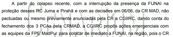 “A equipe avalia que, para efetivar dados mais concretos, faz-se necessário realizar expedições ao longo do território para averiguação dos relatos, considerando, sobretudo, a proximidade do local de possível avistamento com propriedades particulares, bem como demais territórios indígenas, como os Jiahui e os Parintintin. O local também é de uso contínuo dos Pirahã, o que torna a leitura de vestígios de isolados difícil de ser realizada”, diz um trecho do documento.