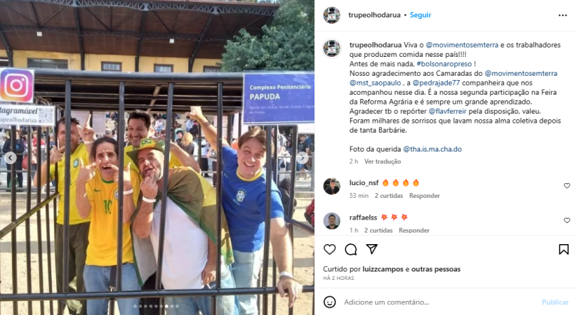 “Viva o @movimentosemterra e os trabalhadores que produzem comida nesse País!!!! Antes de mais nada, #bolsonaropreso!“, afirmou o grupo teatro em uma publicação no Instagram.