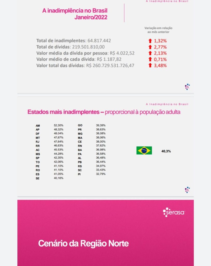 Segundo dados da Serasa, exceto o Pará, com 36,58%, todos os outros Estados apresentam índices acima da média quando o assunto é inadimplência. Depois do Amazonas, o segundo lugar é ocupado pelo Amapá, com 48,32%; em terceiro lugar fica o Estado de Roraima, com 46,63%. Acre, Tocantins e Rondônia apresentam 45,53%, 42,06% e 41,10% da população adulta do Norte endividada, respectivamente.