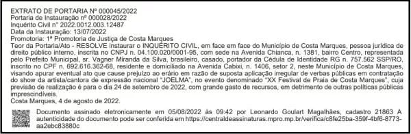 VILHENA (RO) – Costa Marques, pequeno município do interior de Rondônia, a 713 quilômetros de Porto Velho, e com população estimada em 19 mil habitantes, se prepara para a maior edição do ‘Festival de Praia’, em 22 anos de tradição. Serão quatro dias de festa, em setembro, e expectativa de 30 mil visitantes, devido à atração principal: o show da cantora Joelma. O evento entrou na mira do Ministério Público Estadual (MPRO). Segundo o órgão, que publicou instauração civil em seu Diário Oficial, existe a suspeita de aplicação irregular de verba pública na contratação.
