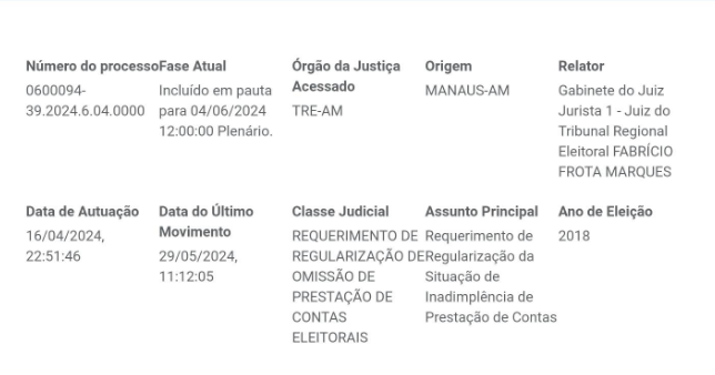 Segundo a Justiça Eleitoral, Renato Júnior foi autuado, no dia 16 de abril deste ano, para regularizar a “situação de inadimplência de prestação de contas” junto ao órgão, no processo 39.2024.6.04.0000. A irregularidade corresponde ao pleito de 2018, quando ele concorreu ao cargo de deputado estadual.
