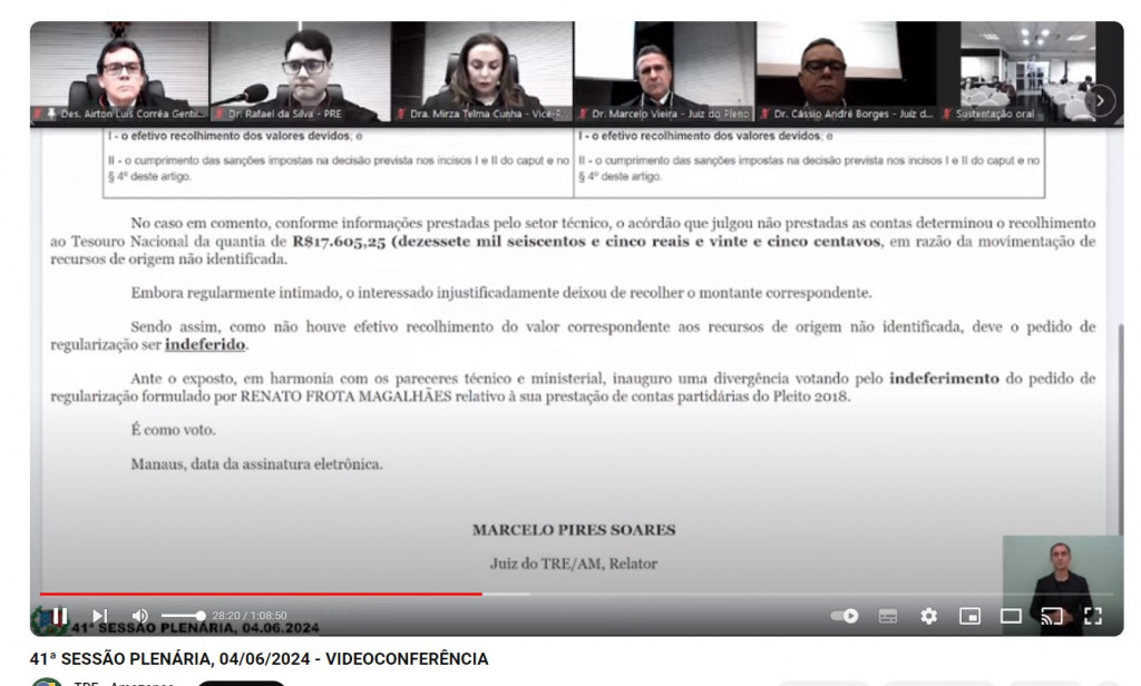 O relator do processo, juiz eleitoral Marcelo Pires Soares, votou pelo indeferimento do pedido de regularização feito pela defesa do secretário municipal. “Embora regularmente intimado, o interessado injustificadamente deixou de recolher o montante correspondente. Sendo assim, como não houve efetivo recolhimento do valor correspondente aos recursos de origem não identificada, deve o pedido de regularização ser indeferido”, diz trecho da manifestação.