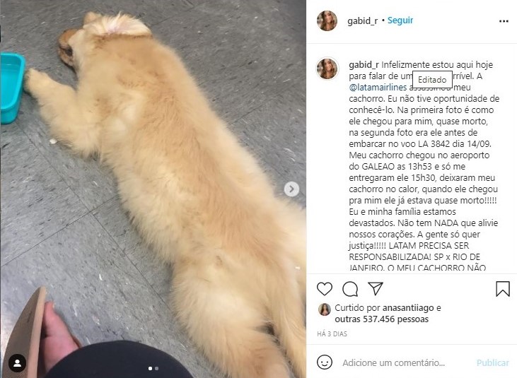 “A Latam Airlines assassinou o meu cachorro. Eu não tive oportunidade de conhecê-lo”, escreveu Rasseli, em uma publicação no Instagram que tem mais de 35 mil comentários. Ela completa que “na primeira foto, é como ele chegou para mim, quase morto. Na segunda foto, era ele antes de embarcar no voo LA 3842, dia 14”, conta, mostrando o animal desfalecido ao lado de uma vasilha com água.