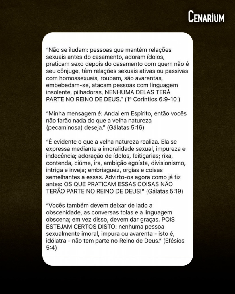Na mesma postagem, o pastor afirmou que quem vive no adultério ou em prostituição estava condenado. “Você que vive no adultério, na prostituição (sexo sem compromisso, sexo entre namorados), na pornografia, na impureza, na lascívia, na mentira, no engano, na desonestidade, na falsidade, na fofoca, que arruma confusão, trai seu cônjuge, fala palavrão, tem inveja, pensamentos de vingança, bebe para encher a cara, fuma — tudo isso é pecado, e o salário do pecado é a morte. Se você não aceitar a correção do Eterno, você vai morrer”.