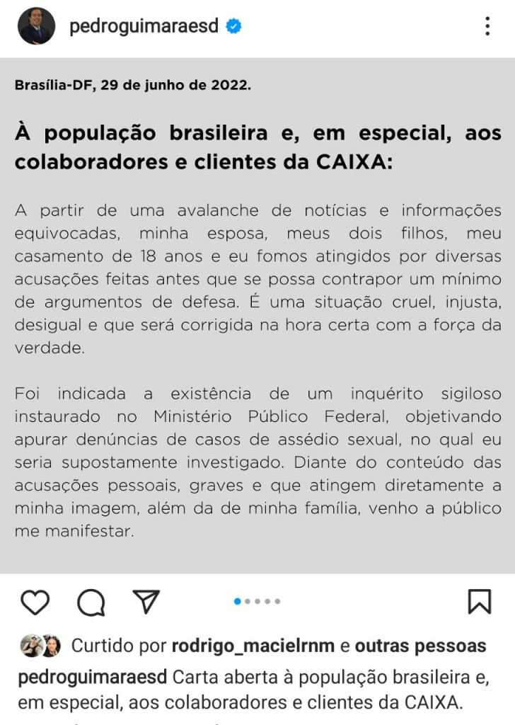 No dia 29 de junho, após ser acusado de assédio sexual por funcionárias das unidades bancárias, Pedro Guimarães anunciou a saída do cargo de presidência da Caixa. A saída de Pedro, que estava no cargo desde o início do atual governo, em 2019, foi acompanha de uma carta aberta publicada nas redes sociais.