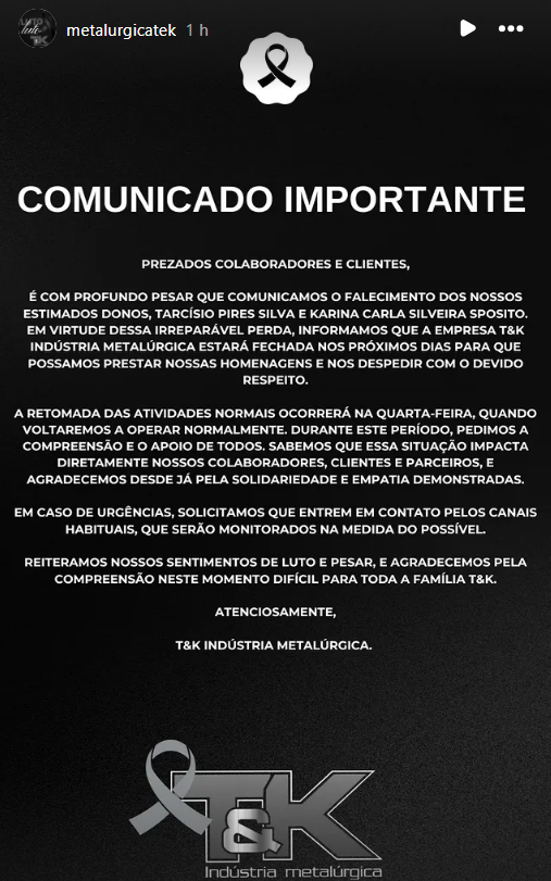 MANAUS (AM) – O casal de empresários Tarcísio Pires Silva e Karina Carla Silveira Sposito, que morreu na madrugada de sábado, 27, no incêndio em um hotel em Fortaleza (CE), era proprietário da empresa metalúrgica T&K, localizada no Estado da Paraíba. A confirmação veio da própria empresa, por meio das redes sociais.