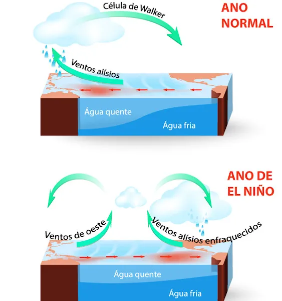Lã Niña é um evento climático e fenômeno oceânico-atmosférico caracterizado pelo resfriamento anormal das águas do Oceano Pacífico Equatorial. Já o El Niño, também conhecido como El Niño Oscilação-Sul (ESNO), é um fenômeno atmosférico-oceânico caracterizado por um aquecimento anormal das águas superficiais do Oceano Pacífico Tropical.