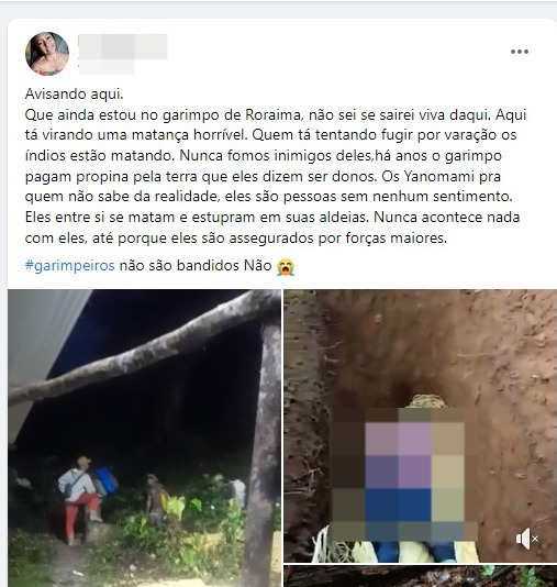 Uma dessas internautas publicou vídeos e fotos de garimpeiros mortos em conflitos com indígenas. Na legenda, ela escreveu que não sabia se sairia viva do território indígena. “Aqui está virando uma matança horrível. Quem está tentando fugir por varação, os índios estão matando”, revela.