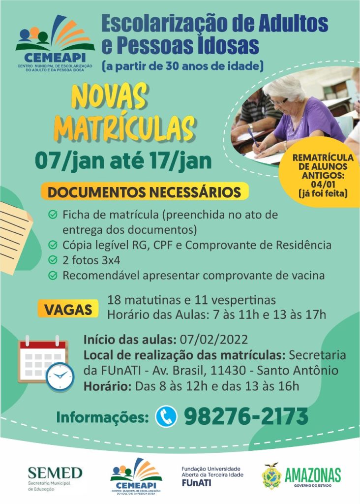 A Fundação Universidade Aberta da Terceira Idade (FUnATI), em parceria com a Secretaria Municipal de Educação (Semed-Manaus), abre inscrições para escolarização de adultos e idosos, nesta sexta-feira, 07. Serão oferecidas 29 vagas para pessoas a partir de 30 anos de idade.