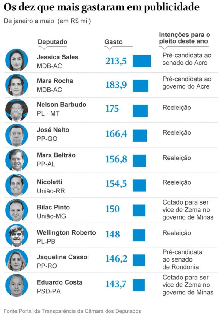 Dos 513 representantes eleitos, 51 gastaram mais de R$ 100 mil em publicidade no período analisado. As primeiras do ranking foram, respectivamente, Jéssica Sales e Mara Rocha, apostas do MDB no Acre: a primeira, pré-candidata ao Senado, pagou R$ 213,5 mil em fotografia, material publicitário e divulgação em rádios e sites. A maior parte do que recebeu da cota no período foi para se promover. Em janeiro, por exemplo, dos R$ 36,5 mil recebidos por Jéssica, R$ 36,1 mil foram para publicidade.