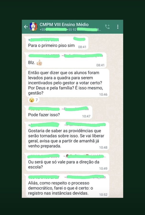 Os professores Colégio Militar CMPM VIII mostraram indignação no grupo de professores na conversa por aplicativo: “Então quer dizer que os alunos foram levados para a quadra para serem incentivados pelo gestor a votar certo? Por Deus e pela família? É isso mesmo, gestão?”, questionou um professor, sem obter resposta do major no grupo.